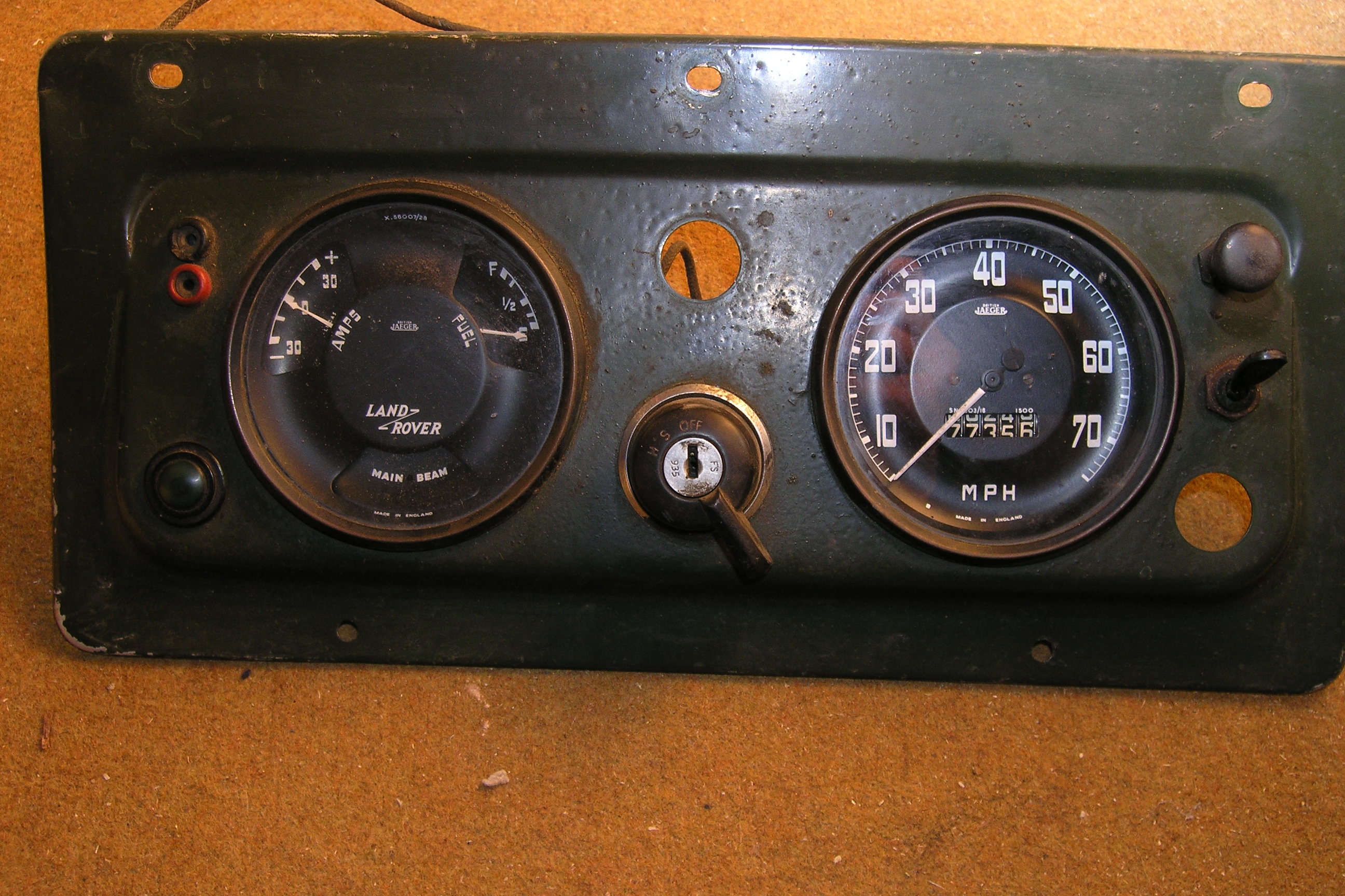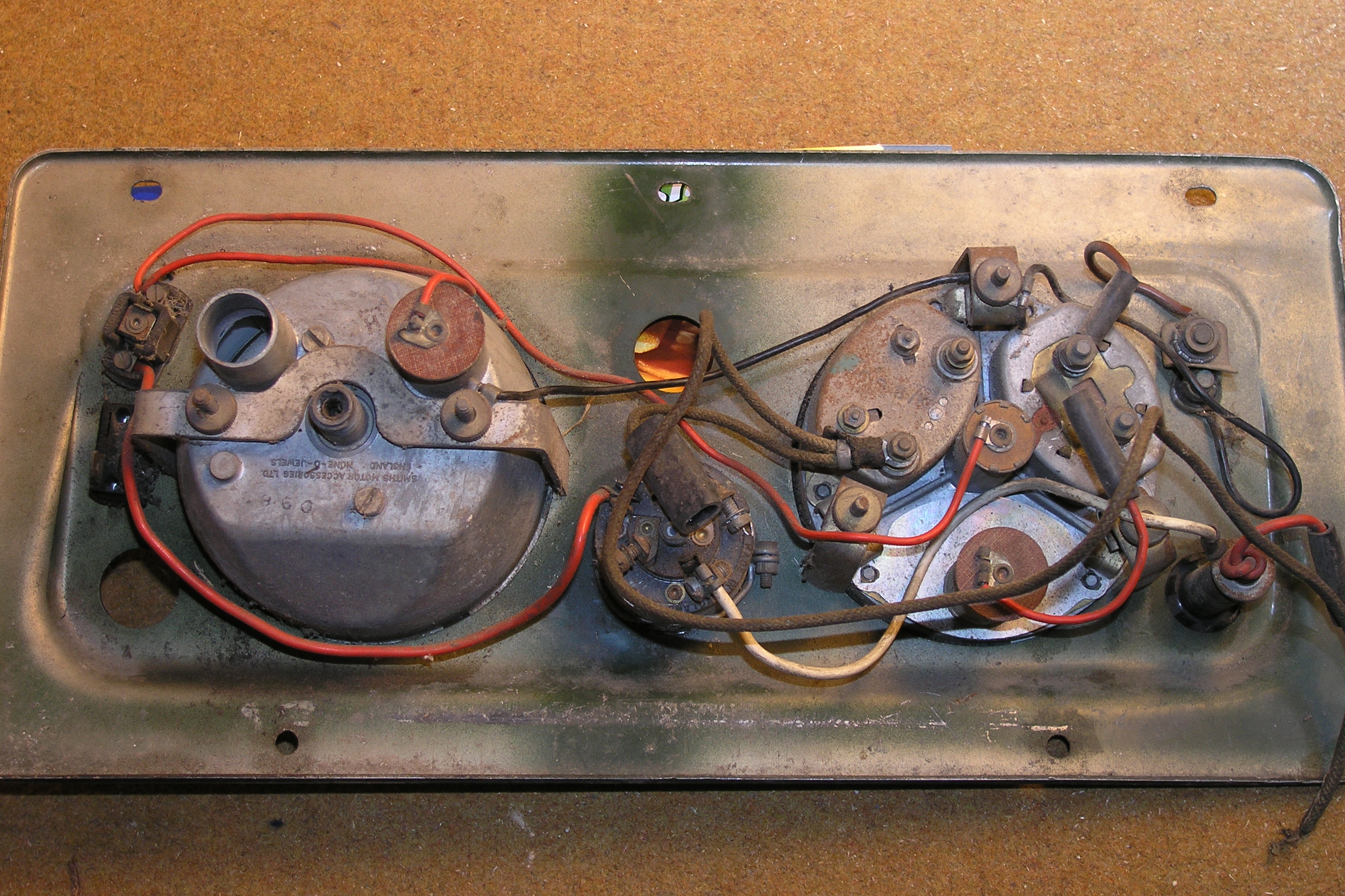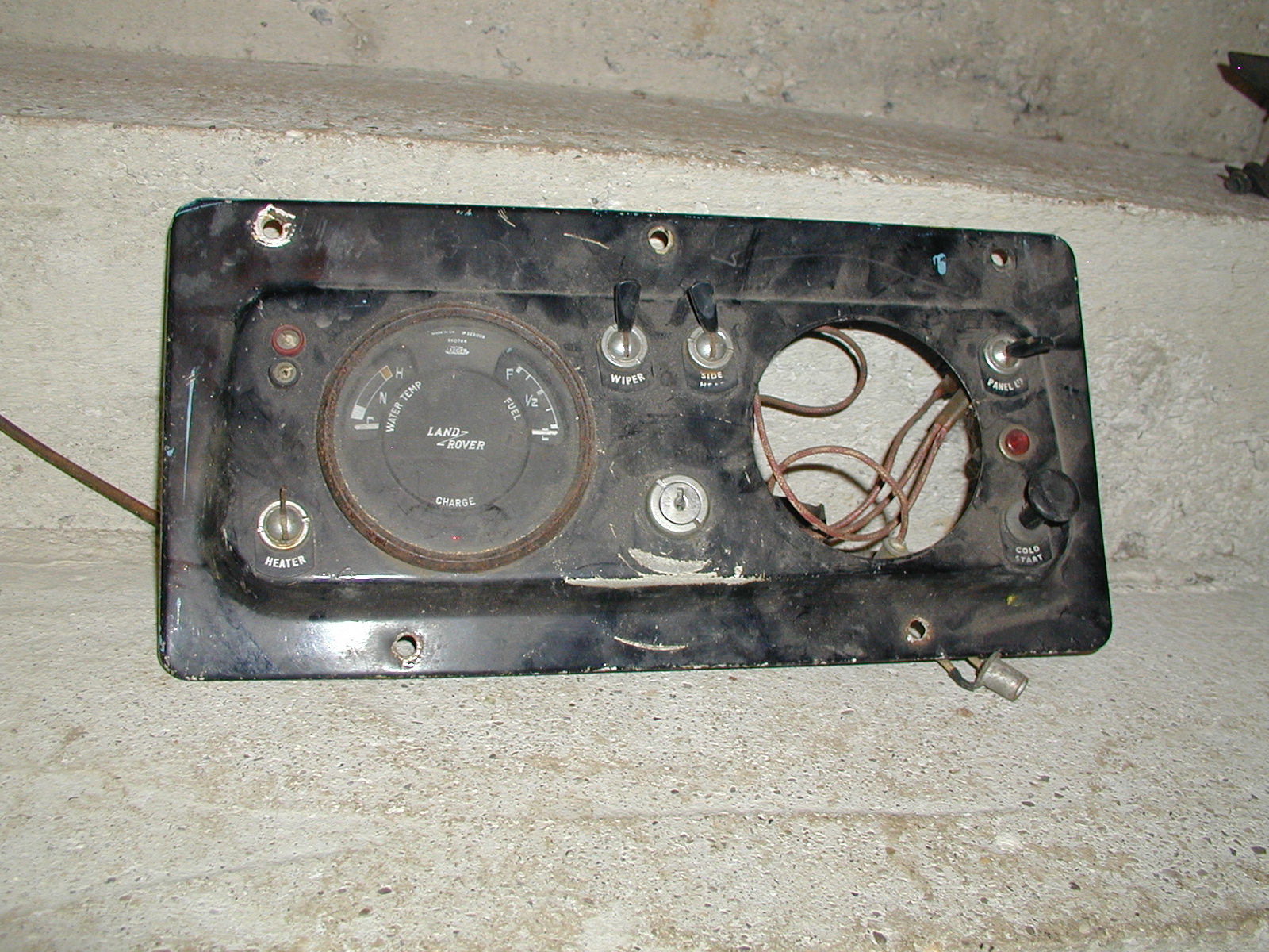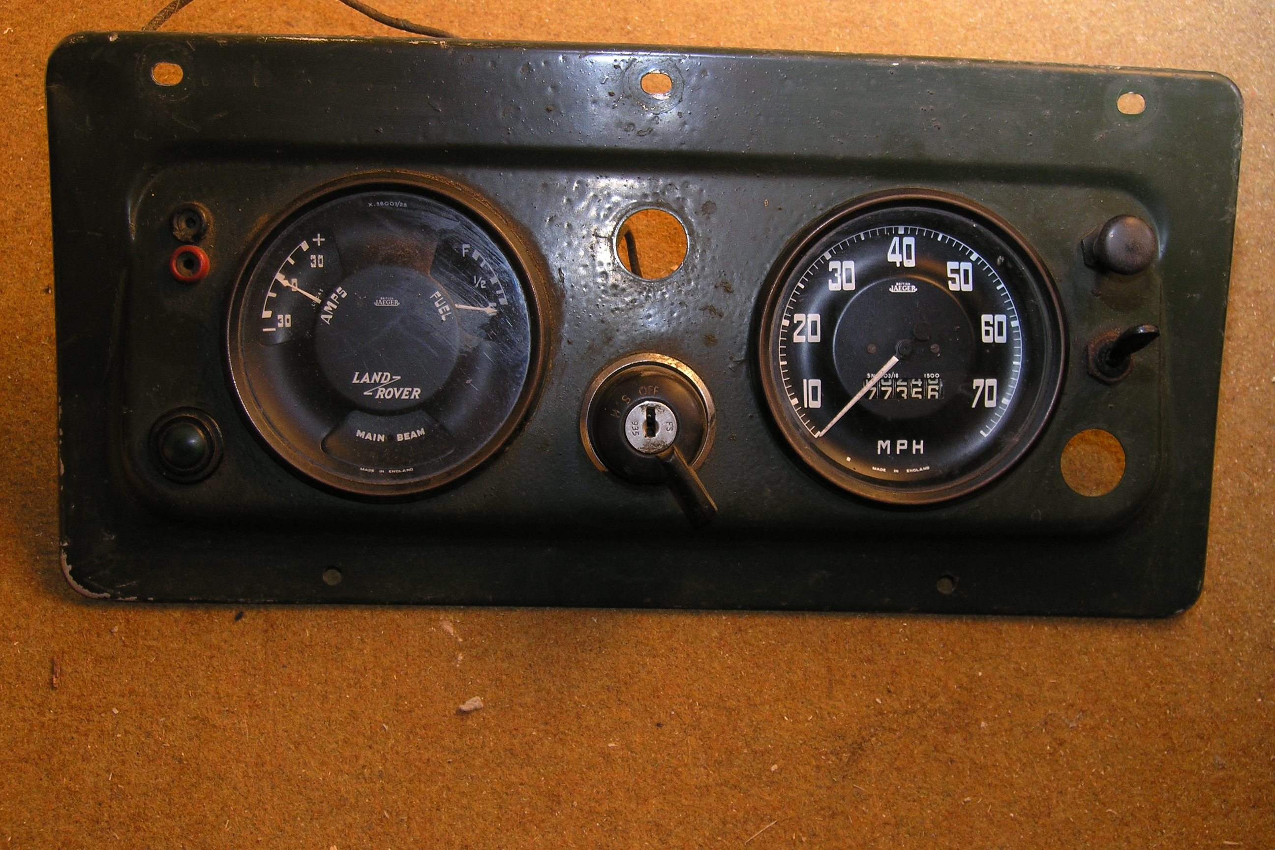 LR - 144002080 - Dashpanel - replacement - black later type with key-starter switch - Rear view - closeup of gauge assemblies |